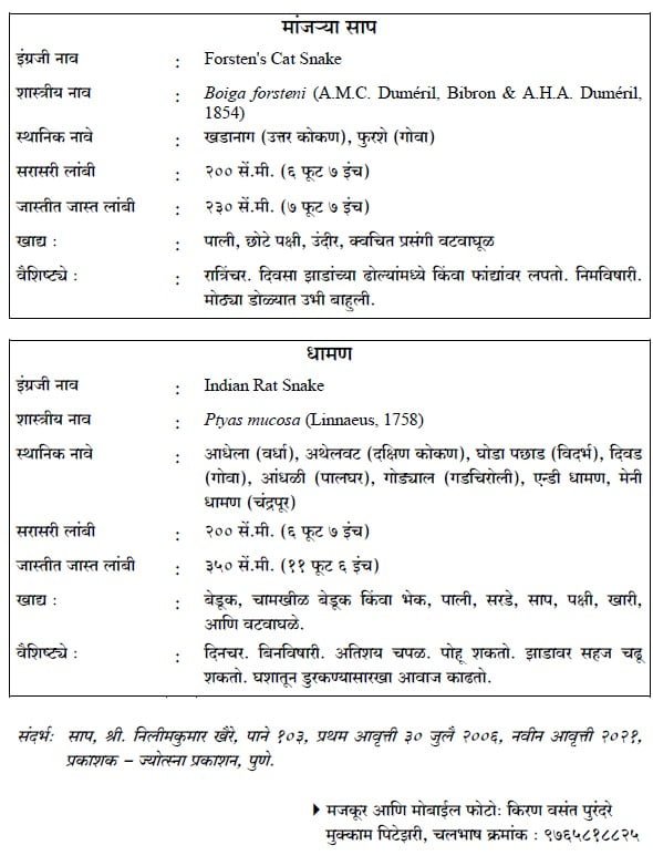 मूर्तिमंत चैतन्य अशी धामण आणि जरा ढेपाळलेला पण देखणा असा मांजऱ्या त्याच दिवशी युवराज आणि त्याच्या मित्रांनी योग्य अधिवासात सोडून दिला. मी युवराजला निरोप पाठवला –